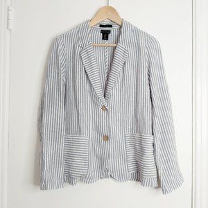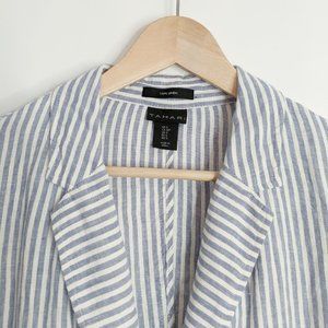 In excellent condition! This beautiful, light blazer is 100% Linen, by designer brand Tahari. It has front pockets, two cork-looking buttons and is the perfect length, hitting at the bottom of the hips.