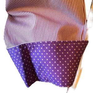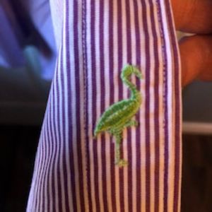 Taylorbyrd 100% cotton, long staple 2-ply yarn; men's dress shirt with embellished cuff, neck, and button closure feature material; very effective! Pattern is a striped purple and white, while the embellishment is small to medium polka-dot in a deeper purple colour. Can definitely be worn as business or casual. The cuff has double-button closure with a smart "V" to show off the variation of colour/pattern on the inner cuff. At the bottom of the button closure tab is the signature flamingo embroidered in green! Beautiful shirt - Like NEW and in immaculate condition. Bought in the USA, so original price is in USD.