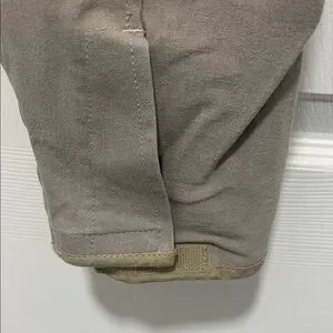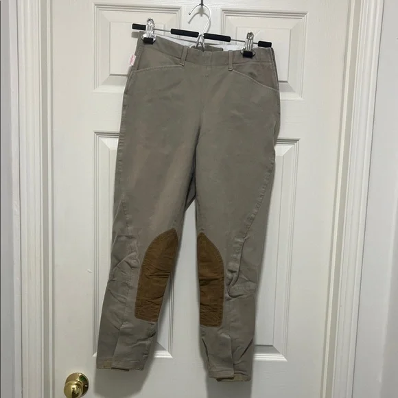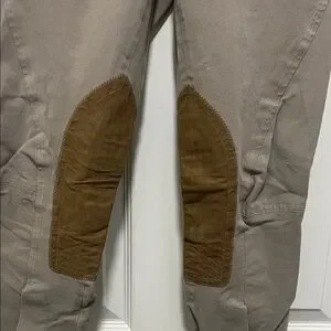 Stylish tan riding pants with brown knee patches. Perfect for equestrian activities.