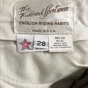 I'm selling a pair of Tailored Sportsman English Riding Habits pants in size 28. These pants are made from 95% cotton and 5% elastic, offering a comfortable and flexible fit for horseback riding. Please note that these pants have been previously worn and are in good condition.