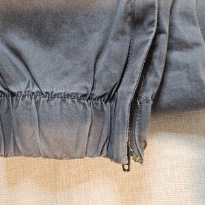 Pull on with string closure. Elastic waist and pant cuffs. Zippered pant cuffs.