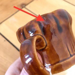 Vintage stoneware pottery mug with a chef's face on the front. Approx. 4" tall x 4 1/4" across including handle, rim is 2 3/4" across. Has hairline crack to glaze only at back of mug near handle (see photo with red arrow), some scuffs/marks to unglazed stoneware portion of mug.