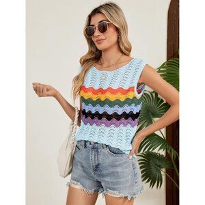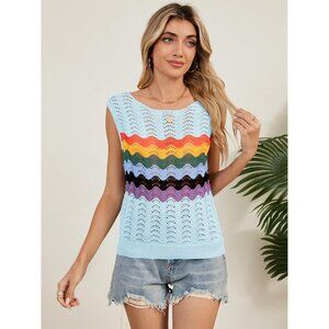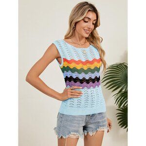Takeyal Women Aqua Green Sleeveless Crochet Tank Casual Summer Striped Sweater