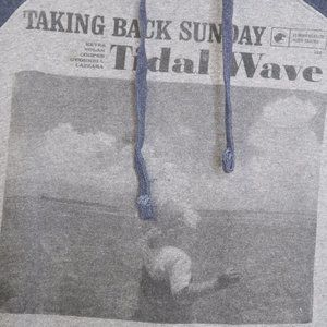 Grey hoodie with navy hood and arms from Taking Back Sunday with Tidal Wave album cover graphic. Size men's small, can also be worn for oversized fit for women.