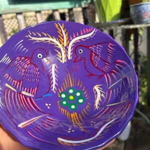Charming decorative plate featuring vibrant bird design. Perfect for adding a touch of color to any space. 6" in diameter 2.5" tall. No Chips Or Cracks.