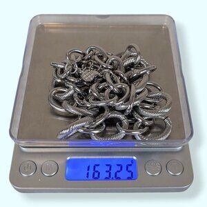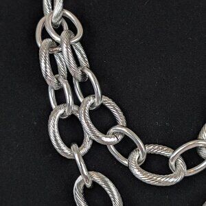 This necklace by Talbots is made of a silver tone metal and has an adjustable lobster clasp closure with a stamped maker's tag. The necklace features a sturdy, thick chain from the clasp towards the front where it splits into two thicker chains. The links alternate between being smooth and having a twisting line texture. The necklace has a decent weight to it and doesn't move too much on its own. There is normal wear, but no issues affecting wearability.
