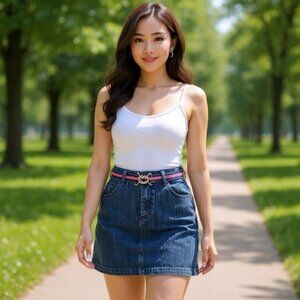 This stylish and versatile stretch denim jean skirt is perfect for adding a touch of retro charm to any wardrobe. It features a classic 90s silhouette, comfortable denim material, and can be styled in various ways, from casual day looks to more dressed-up occasions, with a built-in interlocking belt.