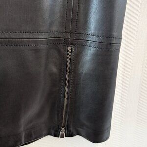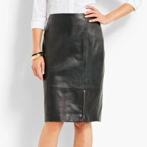 A beautiful and versatile Talbots skirt crafted from soft lambskin leather. This classic, straight-cut skirt features a unique zipper slit in the front for a custom look, and a slit in the back for ease of movement. The skirt is in excellent condition with no flaws.