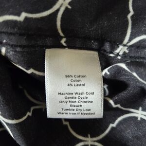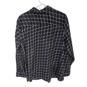 Stylish black blouse with white geometric pattern. Long sleeves. Button-up front. Perfect for casual or office wear. Length 29" Width 25" Sleeves 24"