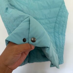 This Talbots vest in a vibrant blue color showcases a chevron quilting pattern and a high stand-up collar, providing both style and warmth. Its sleeveless design and tailored fit make it perfect for layering during cooler weather.