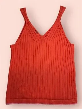 Sleeveless ribbed knit tank with a flattering V-neck. Soft stretch fabric for easy layering. Vibrant orange hue for a bold look.