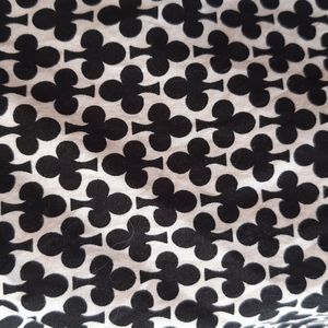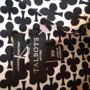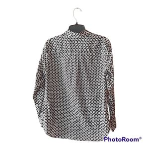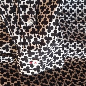 EUC shirt is size 10P. white with black clubs pattern, 5 hidden buttons on front, buttoned sleeves. Crisp and bright, wrinkle resistant. Cotton/spandex. 24" shoulder to hem and 19" armpit to armpit approximately.
