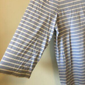 Very good preowned condition, pale blue and white striped long sleeve top with a tie up and fine crochet lace accent at the collar by Talbots. Natural, lightweight and environmentally friendly.