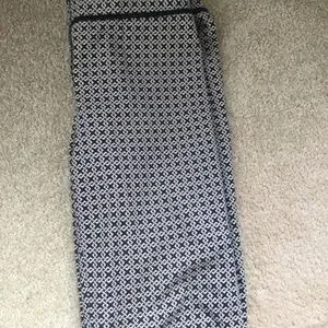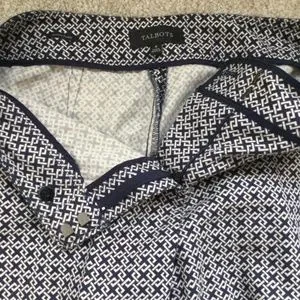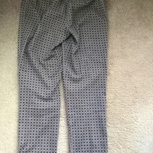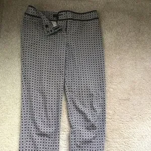 Cropped blue and white design pants with front zipper, button and metal hooks closure