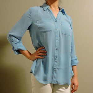 Cyan blue shirt from Talbots, size XS. It has two pockets in the front, and a strap that can be buttoned to roll up the sleeves for a casual look. It drapes down and is loose fitting, and can be worn tucked in or out.