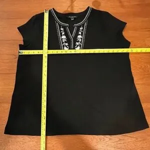 Talbots black slub-knit top with white floral embroidery along the split neckline and around the back of the neck. Cap sleeves, soft stretchy fabric and a relaxed, easy fit.