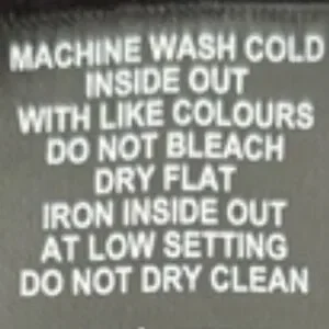 Machine wash cold inside out with like colours. Do not bleach. Dry flat. Iron inside out at low setting. Do not dry clean.