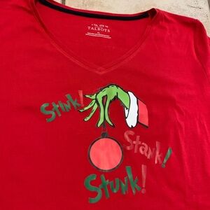 Get into the holiday spirit with this fun and festive Talbots t-shirt! This red, V-neck tee features a graphic of the Grinch's hand holding a Christmas ornament with the classic phrase "Stink! Stank! Stunk!". Made from soft, high-quality 100% Pima cotton, it's comfortable for all-day wear. Perfect for holiday parties, family gatherings, or just showing off your love for the Grinch! This top is a women's size XL and is in great pre-owned condition from a smoke-free home.