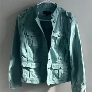 Chic light blue/teal jacket with classic design. Features button accents and practical pockets.