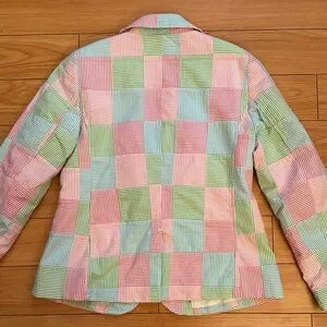 Chic patchwork blazer with pink, green, and white stripes. Perfect for adding flair to any outfit. 100% cotton.