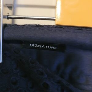 These are Talbots Signature Eyelet Lace Ankle Pants in navy blue. They feature a straight-leg style, are fully lined, and typically have front slash pockets and faux back welt pockets. The outer shell is 100% cotton with an eyelet overlay, making them suitable for business casual, travel, and workwear.