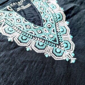 This navy 100% cotton tee from Talbots is in excellent used condition. No noted rips, holes, stains or areas of excess wear. Beautiful embroidery and a flattering 3/4 sleeve and side slits with a slightly longer length. Note this is a petite size, so check measurements in listing to see where it will hit you.