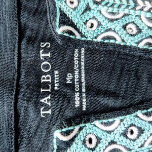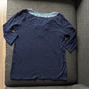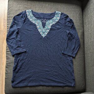 Talbots Navy Embroidered Split Neck Tee - 100% Cotton