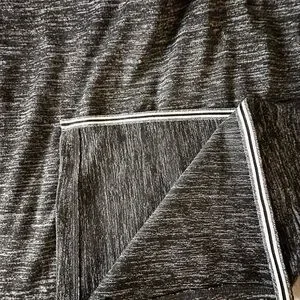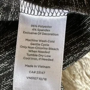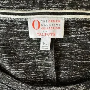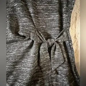 An “opra dress”, gray, short-sleeved dress with a tie at the waist and a white-lined detail at the hem.