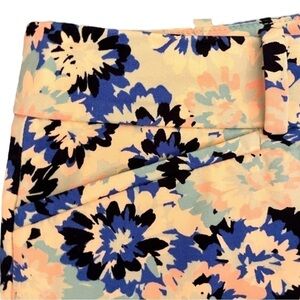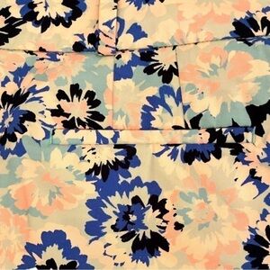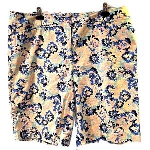Talbots cotton blend 22” Bermuda shorts. Pretty retro-style floral with blues, black and pink on a creamy white background. Cotton spandex blend. Zip and button closure with side slash and back welt pockets.