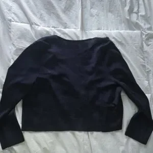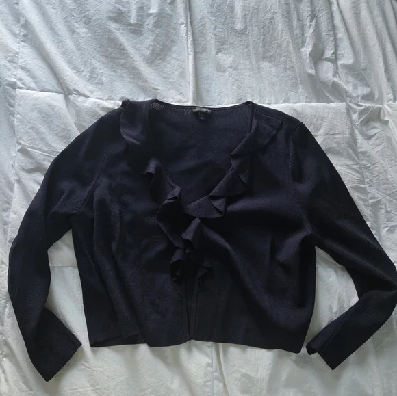 Reposhing this sweater that I purchased from @oliviapar because it's too small for me. It's a beautiful and rich navy blue with a large ruffle in the front. It has a hook/eye closure at the top of the neckline and the rest is open in the front. Loved it, but ready to rotate for something new.