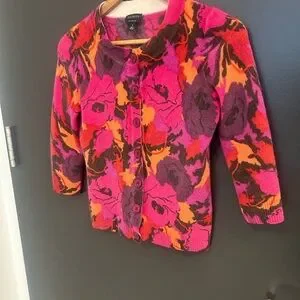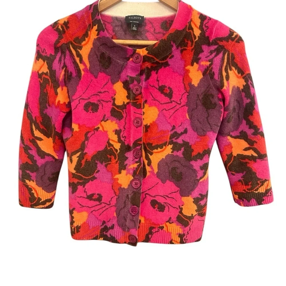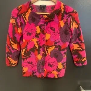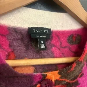 Talbots size S 100 percent cashmere cardigan with button-up front. Features pink, orange, and purple hues- beautiful sweater in beautiful condition! Perfect over a dress or with a skirt as a coverup over for weddings/graduations or amazing with jeans!!