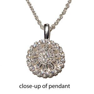 This Brilliant Necklace and Earring set is marked 925 Sterling Silver. The set comes in its original box. The pendant and earrings are each 7/8” in diameter. The chain is 21” long with a sterling lobster claw closure. The pendant and earrings are in excellent condition; the box has one small mark on the edge.
