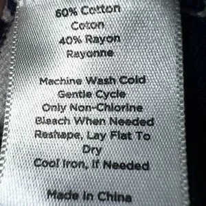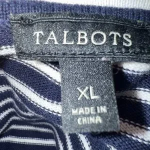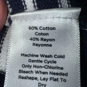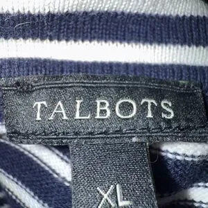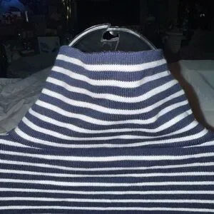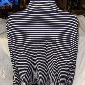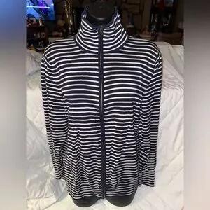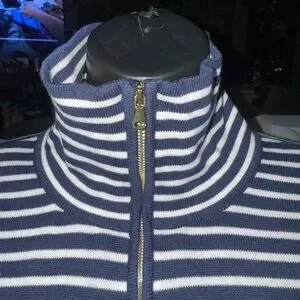 Size XL. In excellent condition. Medium weight cotton/rayon blend stretch knit fabric. Navy and white horizontal stripes throughout. Mock neck. Lightly burnished brass zip front closure. Navy trim on each side of zipper. Long sleeves with ribbed cuffs. Ribbed at bottom. 20 1/2” armpit to armpit 26” length from shoulder seam to bottom hem. There isn’t any holes or wear or stains.