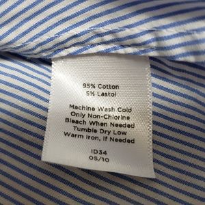 Talbots blue and white stripes button up dress shirt. Ruffles around neckline and halfway down the front. 3/4 sleeves. Size 14.