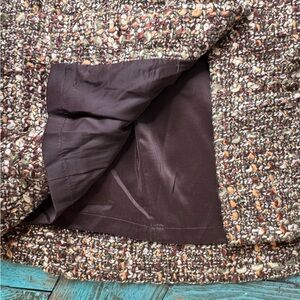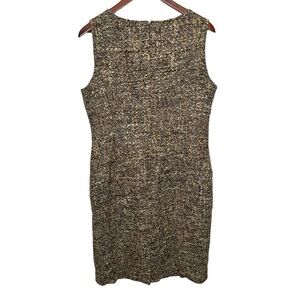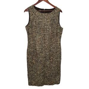 Talbots Women's Tweed Sheath Dress. Brown with green, orange, white and dark red woven throughout, sleeveless, fitted, shift dress, fully lined, slit in the back, hidden zipper closure with eye hook at the top. Easy to dress up or down with a jean or leather jacket or blazer.
