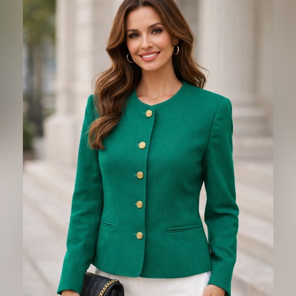 Elevate your wardrobe with this timeless Talbots wool blazer, crafted in a rich, vibrant emerald green that instantly adds a polished, luxe touch to any outfit.