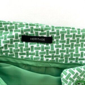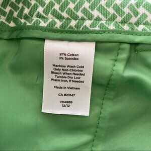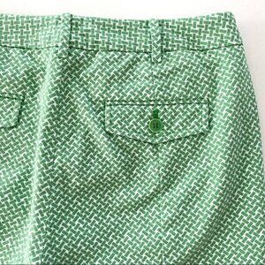 Green and white print fabric is very summery. Fly front opening with zipper. Belt loops. Two side front pockets and two back pockets with flaps. Seams along the centre back and small side slits at the pant hems.