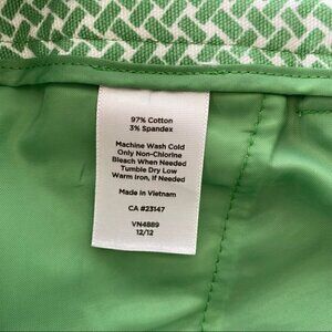 Green and white print fabric is very summery. Fly front opening with zipper. Belt loops. Two side front pockets and two back pockets with flaps. Seams along the centre back and small side slits at the pant hems.
