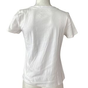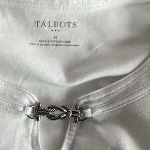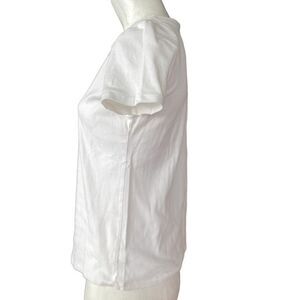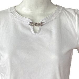 White, cotton, round neck with V and metal detail, short sleeve. EUC, neck to hem 24”, armpit to armpit 18”.