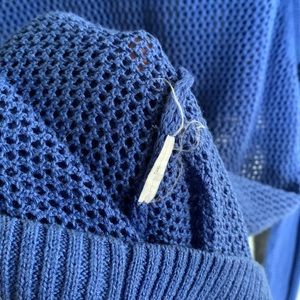 Knit blue sweater tunic size large but work on small as well ( I wore as a beach cover up 👍) fabric content tag removed but is cotton. Wash cold water tumble dry low or hang dry. Approximately 18” pit to pit shoulder to bottom 35 and sleeves from pit to cuff 22”