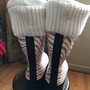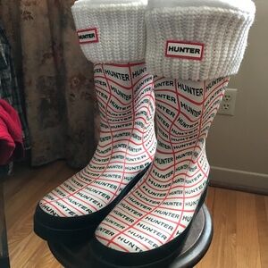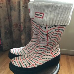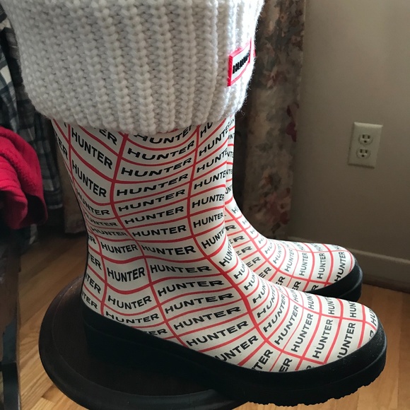 Unique tall Play Hunter rubber boots with all-over pattern. Red, white and black colourway. Black stripe at back and sole. Only wore once or twice, excellent condition. US size 10.