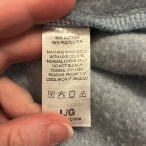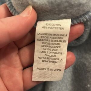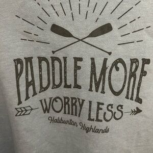 Perfect for the cottage, pulling over your swimsuit, or to wear around a campfire. Very soft and cozy, longer in the back, kangaroo pocket in front and hoodie with drawstring. Haliburton Highlands logo on front. Beautiful, light blue colour. 22” pit to pit. 27.5” shoulder to hem at front.