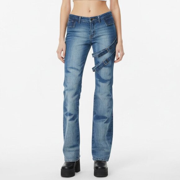 Tall Y2K bleached dark wash flared jeans with thigh buckles ✦ XXS