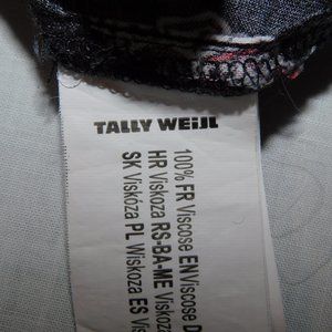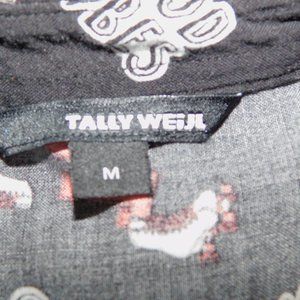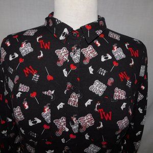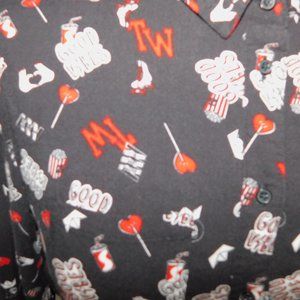 This Womens medium Tally Weijl Black Red White GOOD VIBES heart Lollipops, roller skates , Popcorn ect Blouse is in great clean bright condition. Blouse is 100% Viscose - Machine washable. Features two front open pockets.