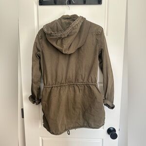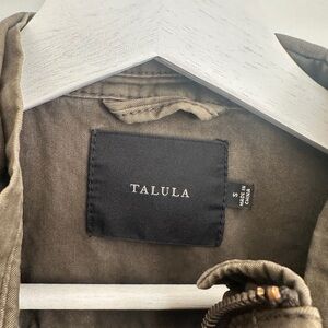 The Talula utility jacket in tan offers a stylish and functional design with a drawstring waist for a flattering silhouette. Its lightweight construction makes it ideal for transitional weather, providing comfort and versatility.