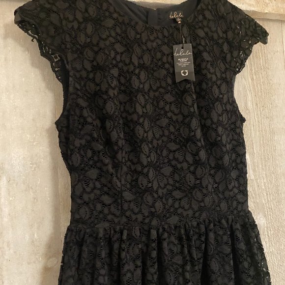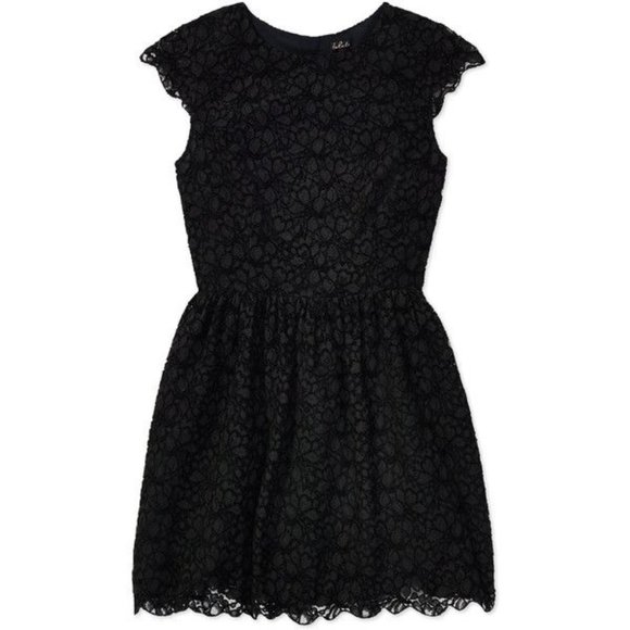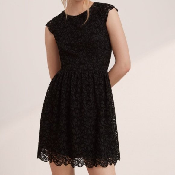 High quality black lace dress is finished with scalloped edges along the cap sleeves and hem, flattering mid section. An exposed zipper at the back.