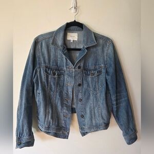 Classic denim jacket from Talula (Aritzia) in a versatile light wash. Features button front, chest flap pockets, side welt pockets, and adjustable waist tabs. 100% cotton with a structured yet comfortable fit.