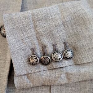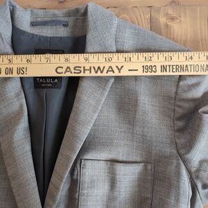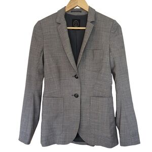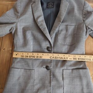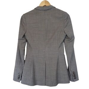 Single breasted, wool blend blazer with striped sleeve lining for rolled sleeve look.