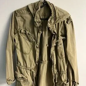 This olive green jacket is perfect for fall weather/ outfits. It’s extra small, but fits more like a small, and has that cute longer length to it.
