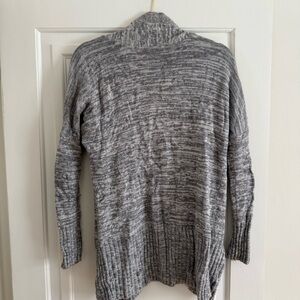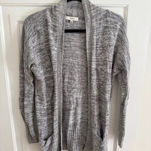 Soft heathered gray knit cardigan with an open front. Long silhouette with ribbed cuffs and hem. Two front pockets for added convenience. Lightweight layer for everyday wear.